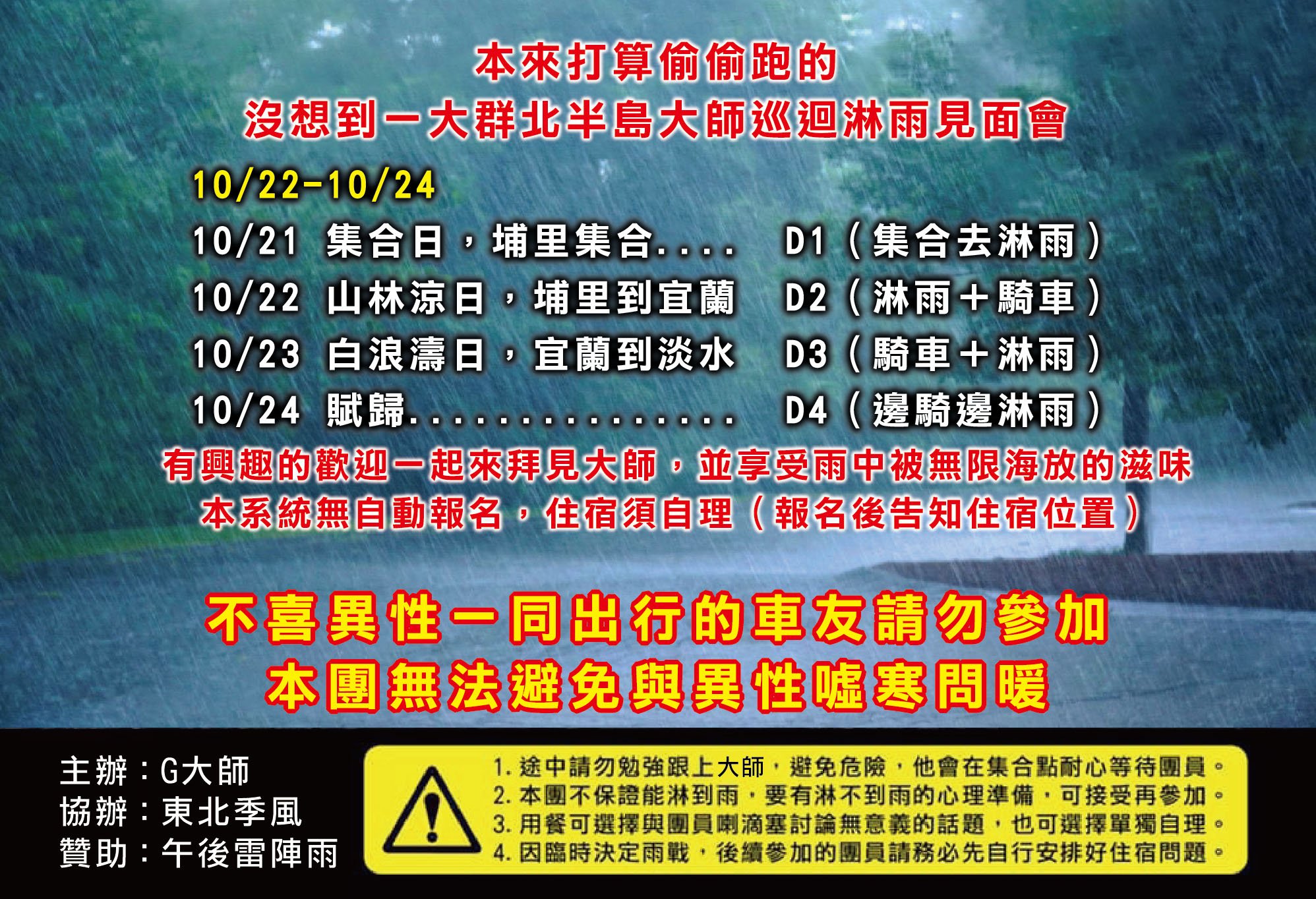 今年,因為疫情與其他種種的原因,淋雨團的時程從原本預定的 9 月一直拖到 10 月底才成行,一直到訂完飯店,還是有被迫放棄的可能性.即便如此,或許大家都悶壞了,這次參加人數從去年的 5 車,暴增到 15 車,而且男女比例達到接近 1:1 的地步.